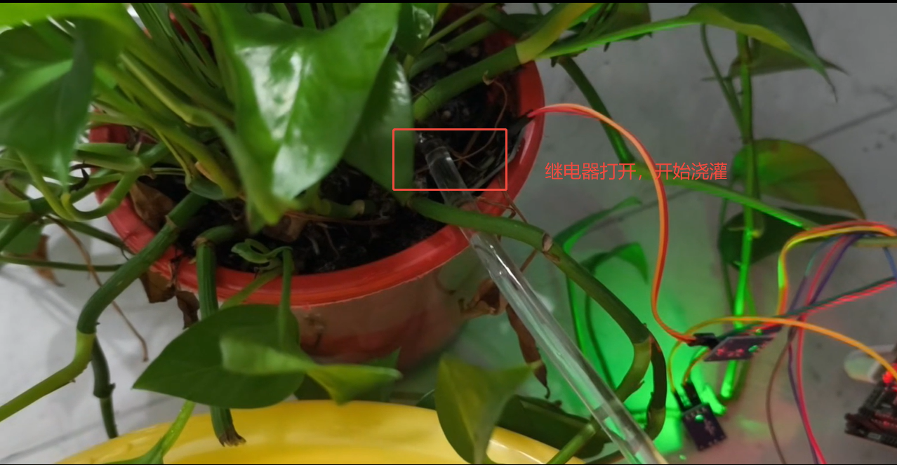 When the humidity is less than 30%RH, the relay opens and irrigation begins. When the humidity is greater than 50%RH, the relay closes and irrigation stops.