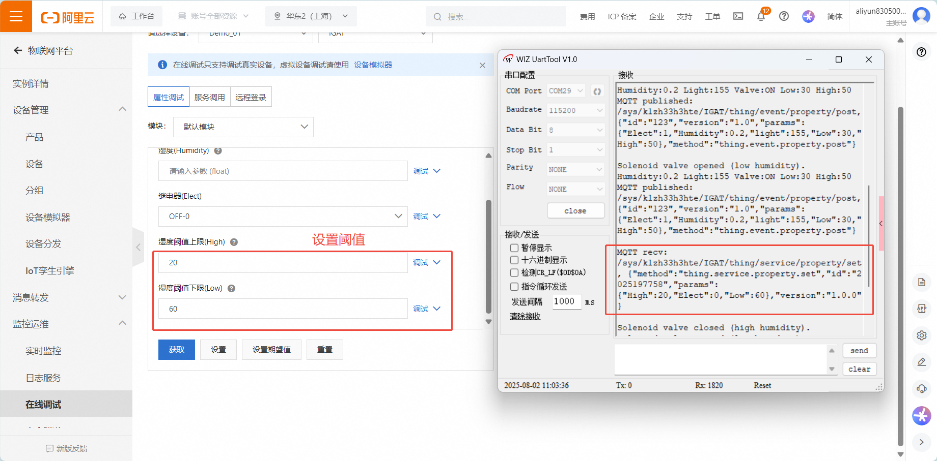 - Publish real-time data (humidity, light intensity, relay status) to the Alibaba platform via MQTT and simultaneously refresh the webpage's environmental data.