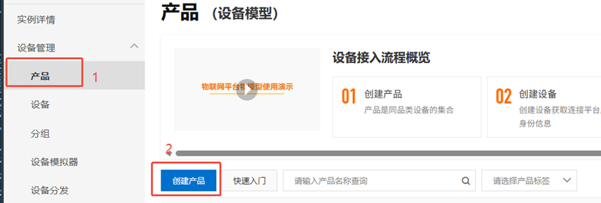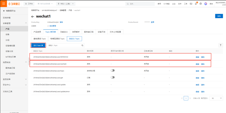 5. Click "Product." Under the "Custom Topic Class," define two topics: one for the W55MH32 and one for the mini-program.