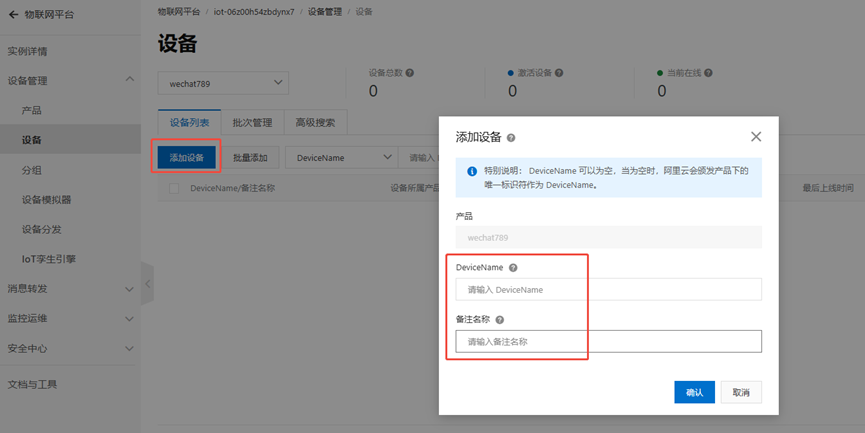 4. Click "Add Device." You can choose and fill in the device name and remarks yourself. This step needs to be repeated twice to add two devices: one for the mini-program and one for the W55MH32. Make sure they are clearly distinguishable and named accordingly.