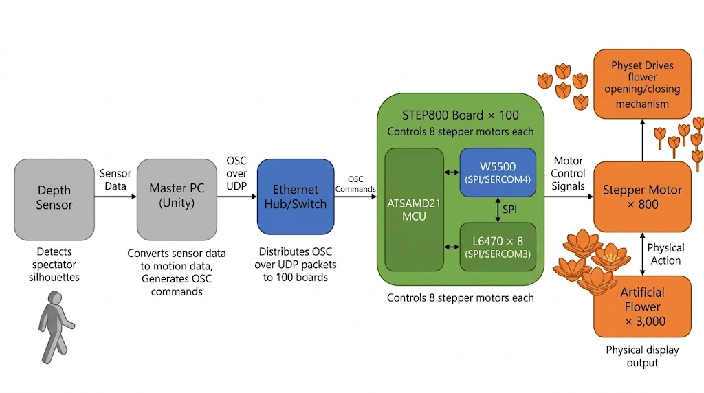 What visitors see is simply the beautiful motion of flowers blooming and closing. Behind this elegant experience, however, lies a precise system where 100 boards communicate over an Ethernet network to control 800 motors at millisecond intervals.