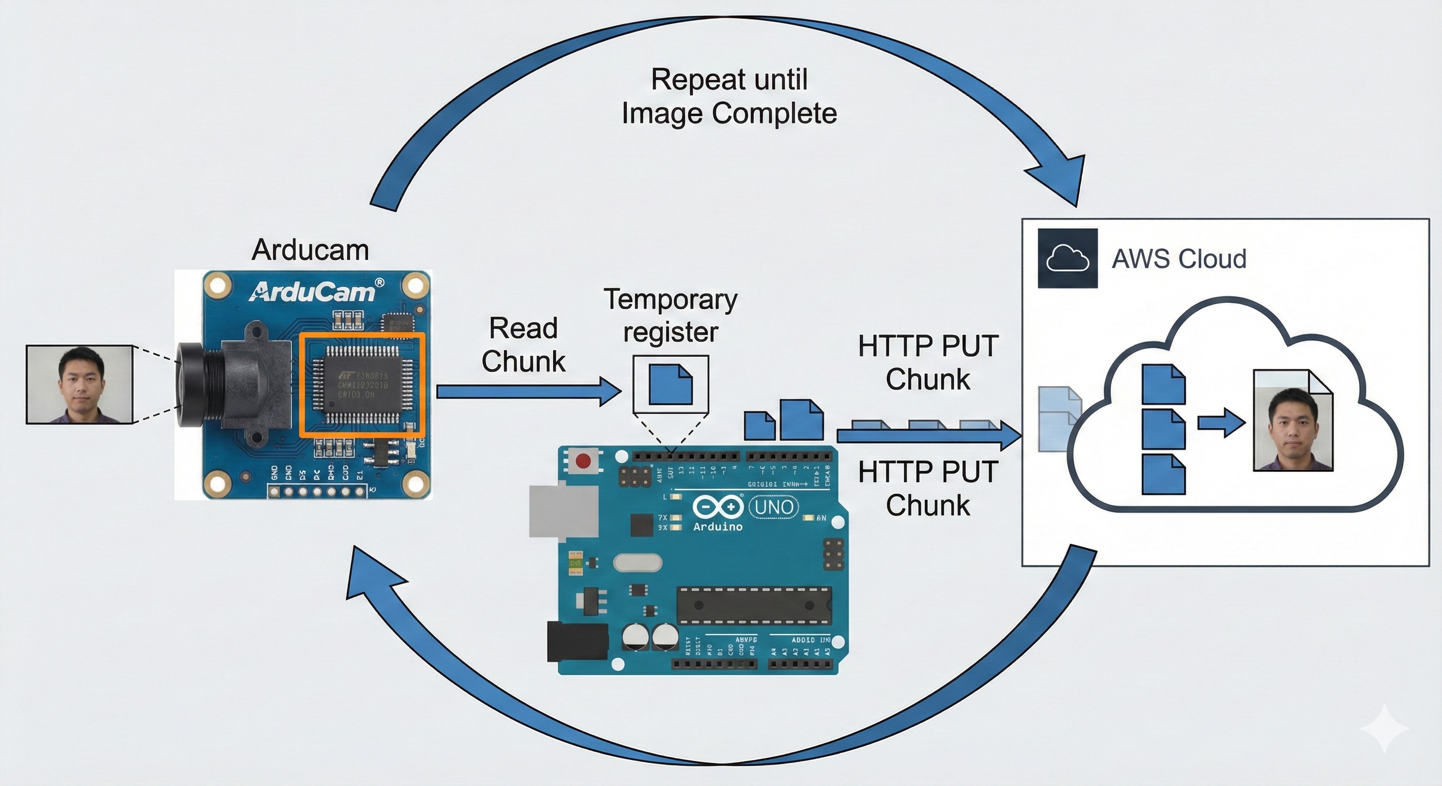 - Transmit: Without storing the chunk, the Arduino immediately sends it to the AWS Cloud via an HTTP PUT request.