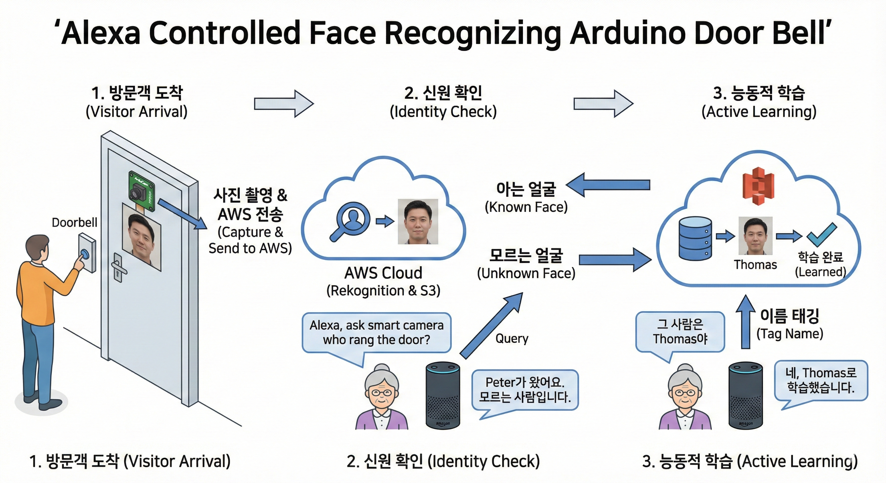 이 프로젝트는 단순히 버튼을 누르면 소리가 나는 초인종을 넘어, "알렉사, 문 앞에 누구야?"라고 물으면 인공지능이 방문자의 얼굴을 식별해 이름을 알려주는 스마트 시스템입니다. 흥미로운 점은 이 고성능 AI 시스템이 고작 몇 천 원짜리 아두이노 보드 위에서 시작된다는 것입니다.