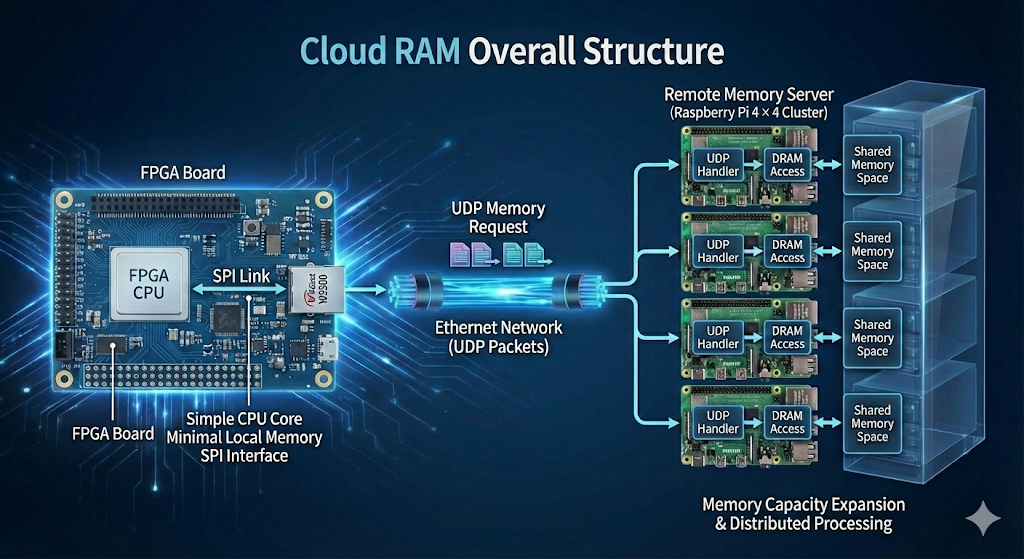 Cloud RAM은 FPGA 기반 CPU가 자신의 로컬 RAM 대신 네트워크를 통해 원격 RAM에 접근하는 구조입니다.
