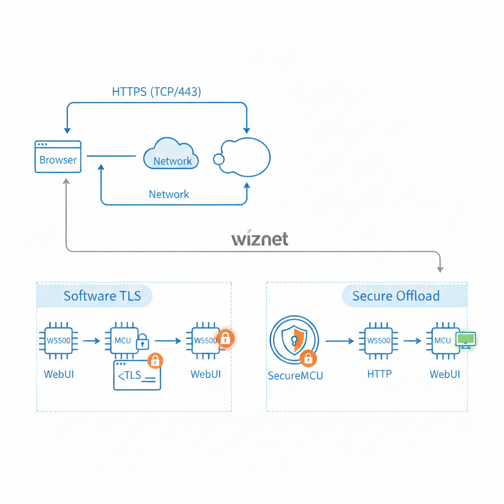 WIZnet의 W5500은 HTTPS를 직접 처리하지는 않지만, Ethernet + TCP/IP 오프로딩이라는 명확한 역할을 수행합니다. TLS를 MCU 또는 보안 칩으로 분리함으로써 다음과 같은 장점을 제공합니다.