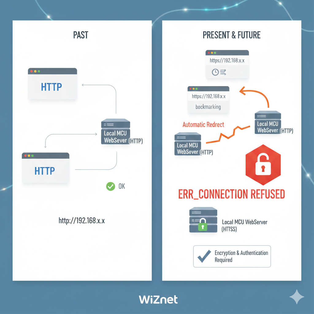 최근 브라우저는 로컬 IP 주소에 대해서도 HTTPS를 우선 적용하는 동작을 보이고 있습니다. 이로 인해 기존 HTTP 기반 MCU WebServer는 정상 동작하더라도 브라우저 측에서 접속 오류가 발생하는 문제가 나타납니다. 본 아티클은 이러한 변화의 배경을 분석하고, 마이컨트롤러 환경에서 HTTPS를 구현하는 현실적인 방법들을 비교·정리합니다. 특히 소프트웨어 TLS(BearSSL) 방식과 하드웨어 보안 칩을 활용한 TLS 오프로딩 방식의 차이를 중심으로, Ethernet 기반 시스템에서의 설계 포인트를 설명합니다.