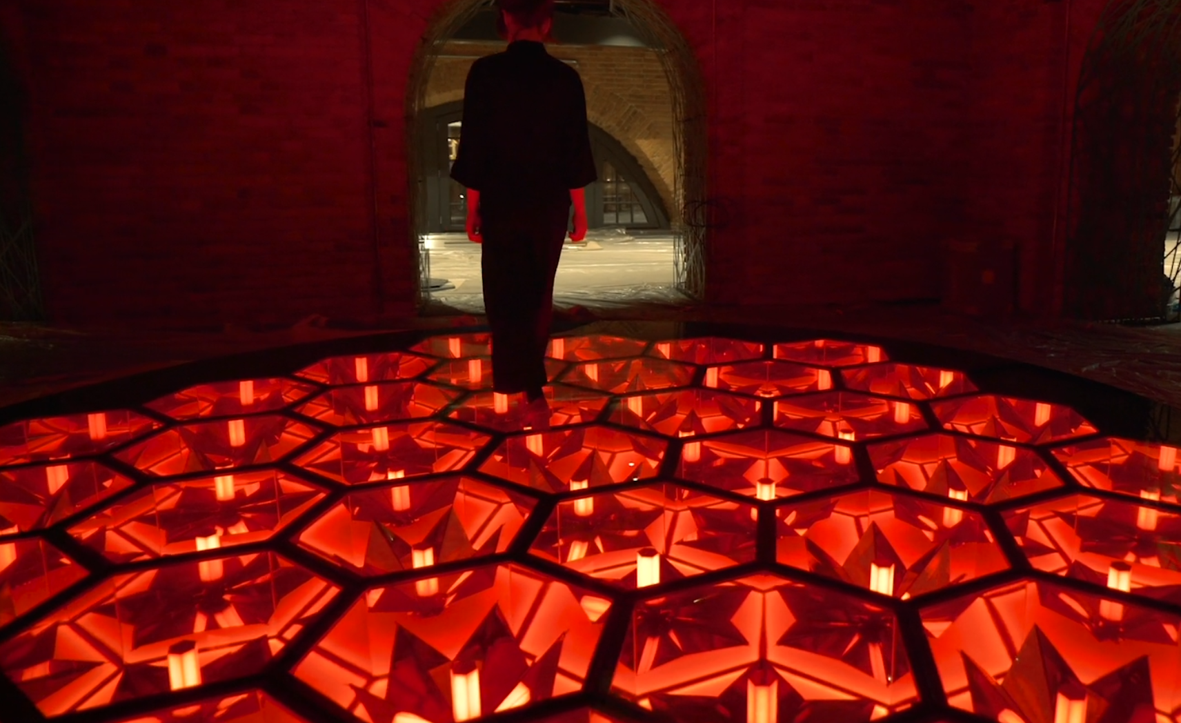 The triplex glass covering the installation allows the light to pass through while simultaneously mirroring the viewers and the surrounding space like a lake's surface. As the shimmering flowers deep within merge with your reflection on the surface, you feel a sense of immersion, as if being pulled into the depths of a surreal pond.