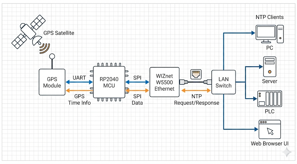 본 프로젝트는 RP2040 기반 Raspberry Pi Pico와 WIZnet W5500 Ethernet 칩을 활용하여 GPS 동기화 NTP 서버를 구현한 사례입니다.