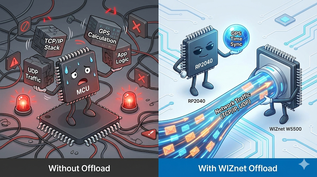 MCU는 GPS 시각 동기와 시간 계산이라는 핵심 로직에 집중할 수 있으며, 네트워크 패킷 처리로 인한 지연이나 부하 증가를 효과적으로 방지할 수 있습니다.