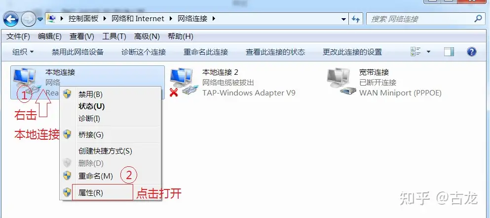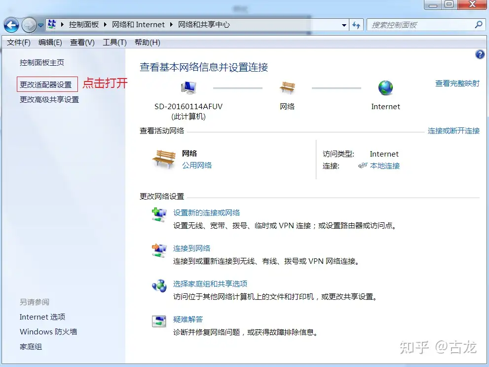 2、点击“更改适配器设置”,出现下图界面,按照图示步骤操作: