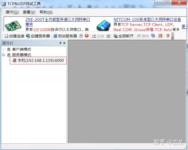 - 双击打开TCP&UDP测试工具,点击创建服务器,如下图: