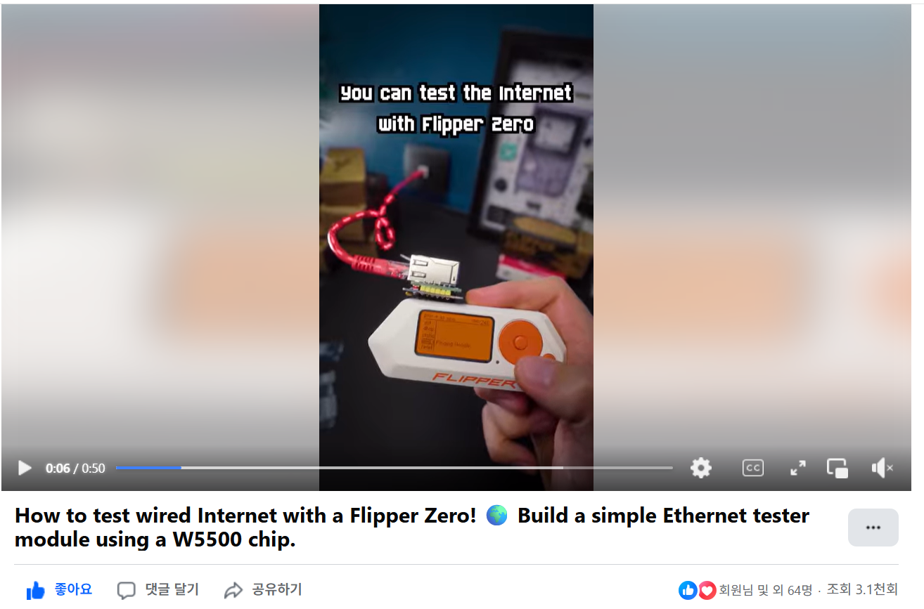 영상에서는 W5500 칩 기반 보드 연결, Flipper Zero와의 인터페이스 구성, Ethernet 케이블 연결 후 Link/Status 확인, 정상·비정상 포트 비교 테스트 등이 실제 데모로 설명되어 있어 누구나 따라할 수 있는 실전형 UCC입니다.