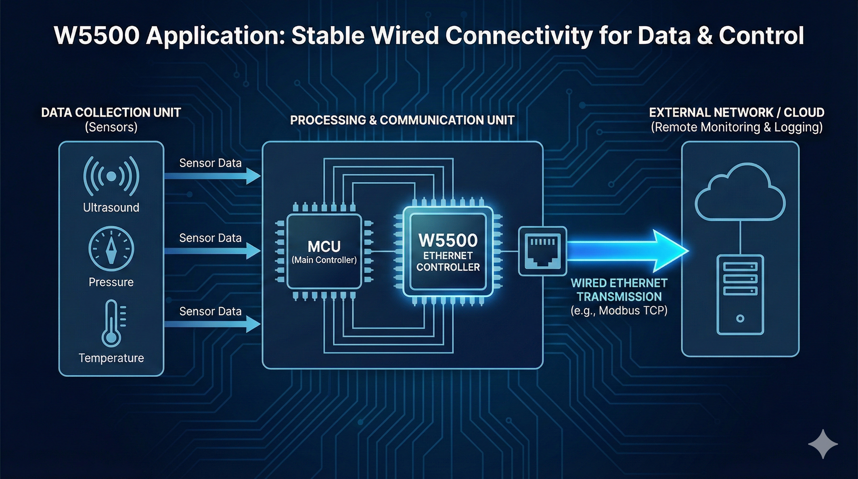 - W5500 can be positioned as a core enabler of the device’s operational data pipeline, not just a connectivity part.