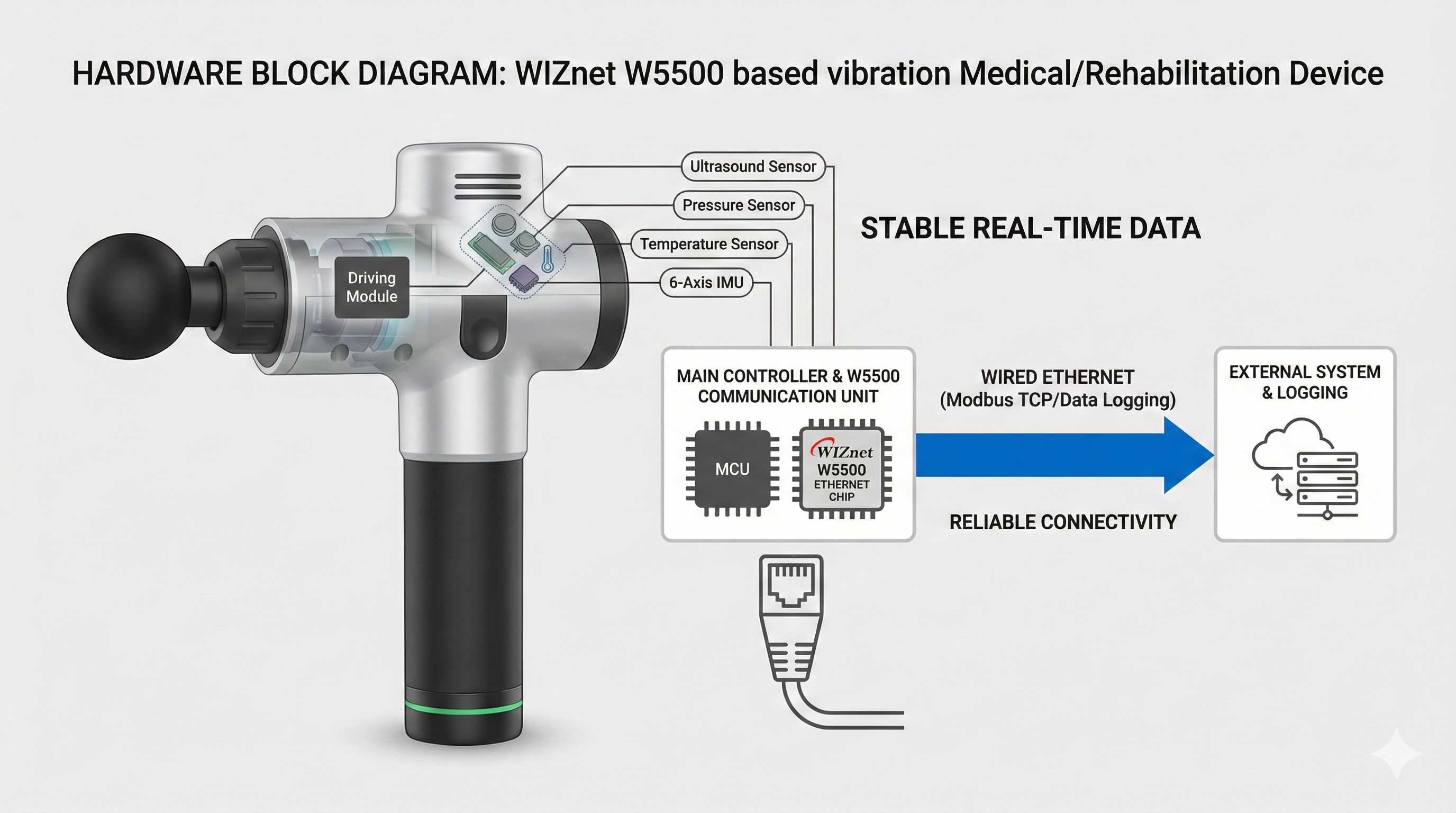 This application describes a vibration-based medical/rehabilitation device architecture that includes a wired Ethernet communication interface using the WIZnet W5500. With W5500 Ethernet (e.g., Modbus TCP), the system can reliably transmit sensor and control data for real-time monitoring, logging, and integration with host/field systems.