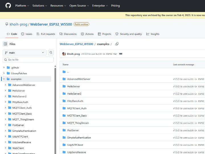 이 링크는 단순한 코드 저장소가 아니라, ESP32 + W5500 기반 Ethernet 애플리케이션을 단계별로 확장해 볼 수 있는 실전 레퍼런스 모음입니다. HTTP 서버 하나에 그치지 않고, 인증, POST 처리, MQTT, UDP, 파일 서빙까지 폭넓게 다루고 있어서 maker.wiznet.io 관점에서 매우 활용도가 높습니다. 다만 저장소가 2023년 2월부터 아카이브 상태라는 점은 함께 적어두는 것이 좋습니다. 그래서 이 프로젝트는 “최신 유지보수 라이브러리”라기보다, W5500 기반 Web/MQTT/UDP 기능을 빠르게 이해하고 응용 방향을 잡기 좋은 참고용 예제 세트로 소개하는 것이 가장 정확합니다.