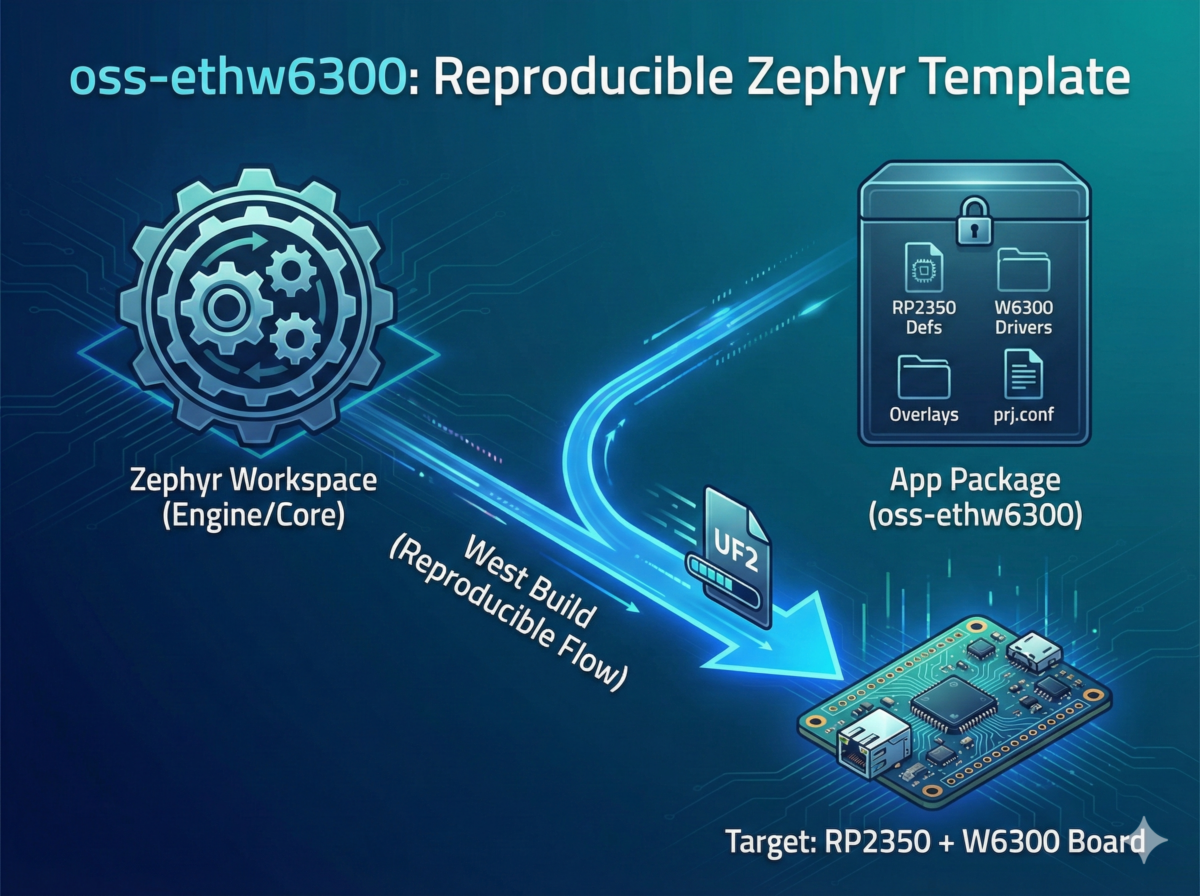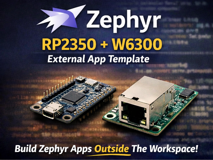 Zephyr 워크스페이스 밖에서 RP2350+W6300 이더넷 보드를 빌드·패키징하는 실전 템플릿. 커스텀 보드/드라이버/설정을 한 프로젝트로 묶어 “재현 가능한 빌드”를 만든다.