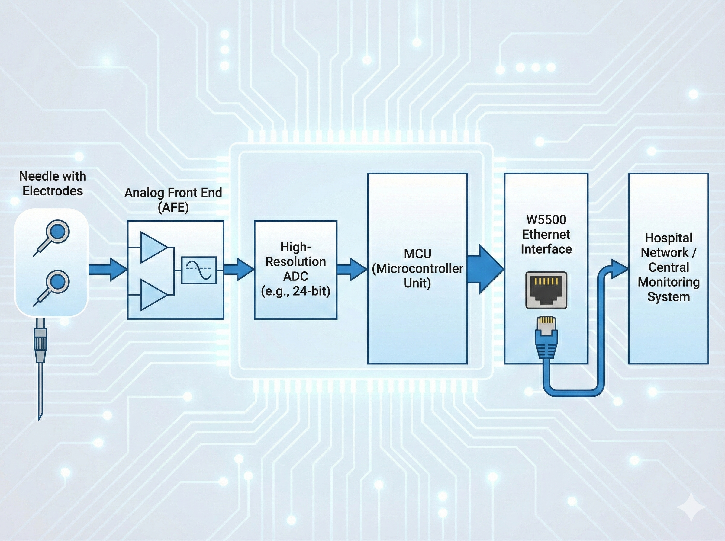 핵심은 4전극 임피던스 측정으로 바늘 위치를 보조 판단하는 구조이고, W5500은 병원 시스템 전송을 위한 구현 예시 부품에 가깝습니다.