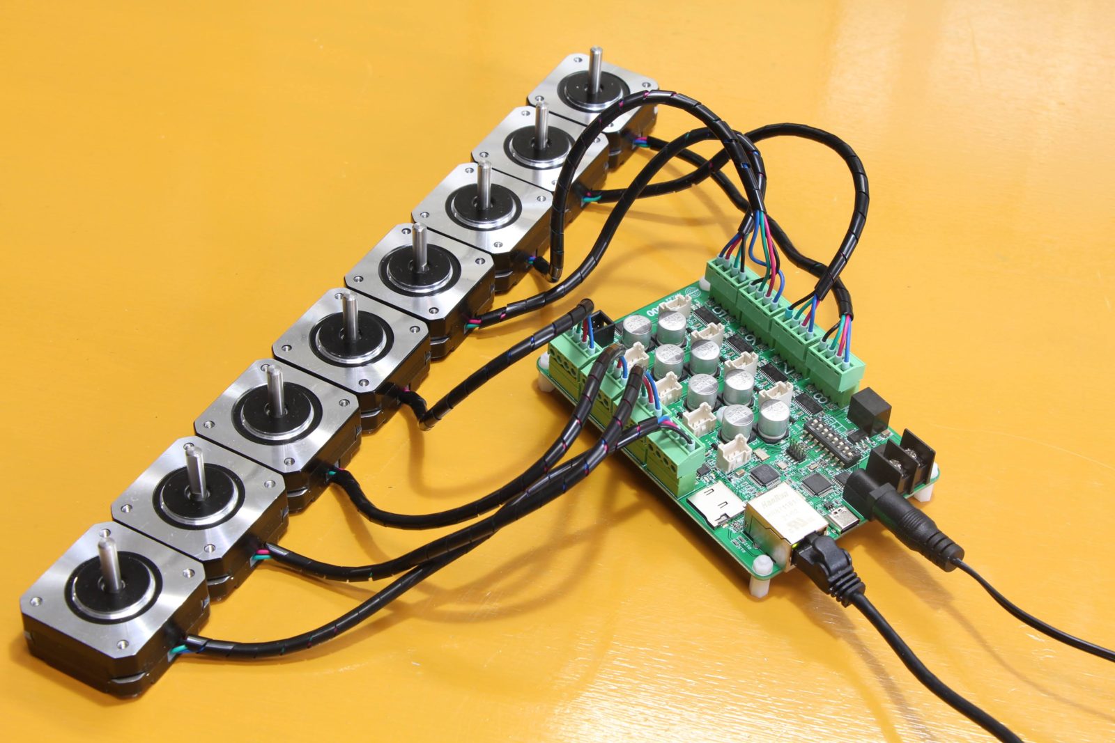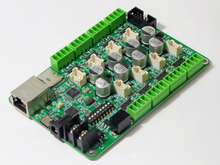 It can control an 8-axis stepper motor. It has the W5500 for connectivity with the ethernet.