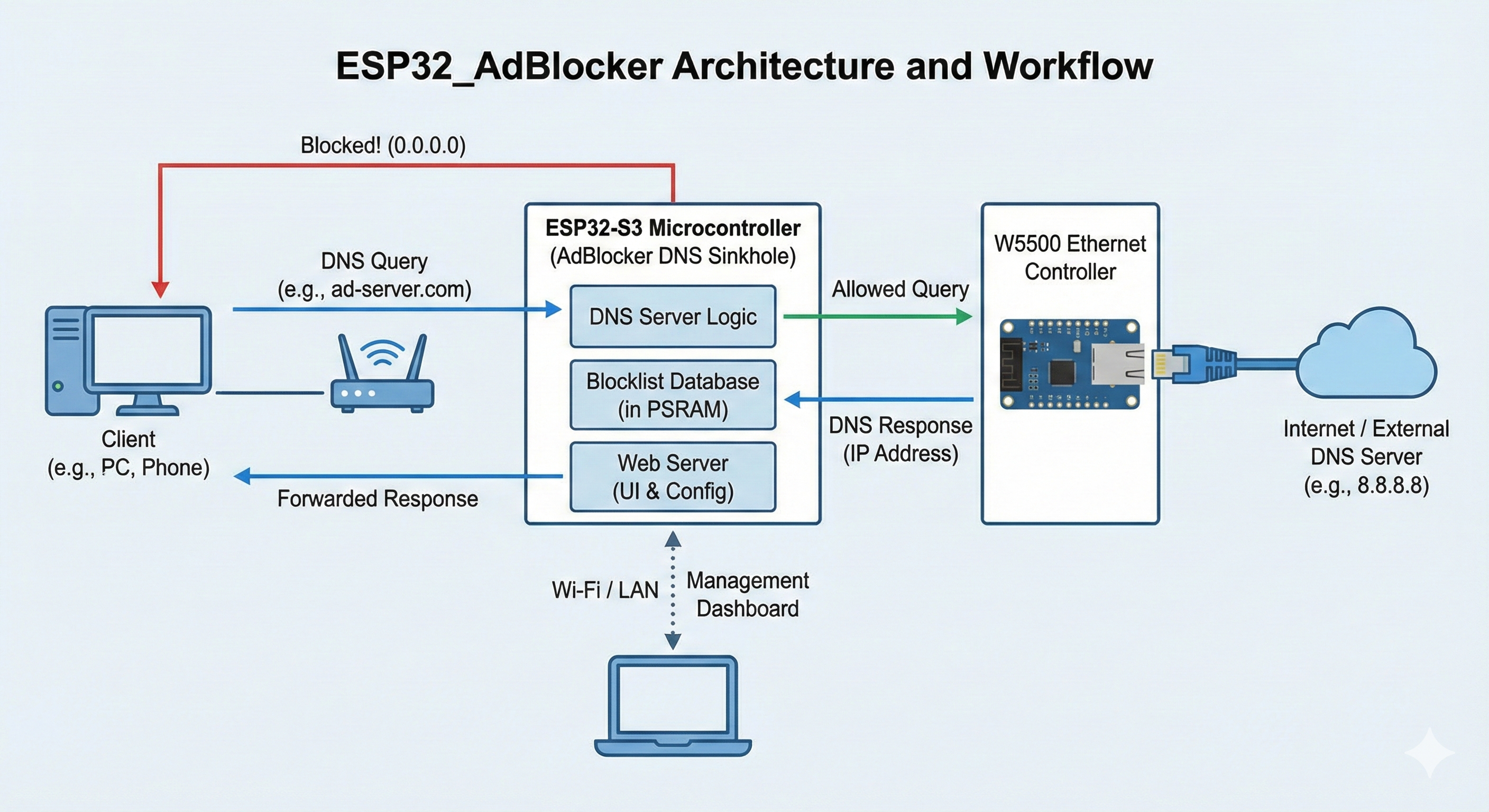 ESP32_AdBlocker is an Arduino-based DNS sinkhole that blocks ads and trackers by answering blocked DNS queries with 0.0.0.0,