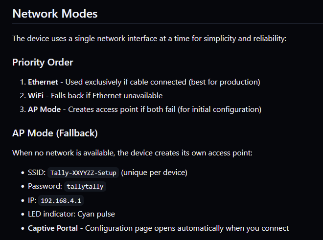 Operationally, it’s closer to an “appliance” than a dev demo: it prefers Ethernet first, falls back to Wi-Fi if needed, and can enter a configuration AP mode with captive portal if neither is available. It also exposes a browser UI plus JSON endpoints (e.g., /status, /info) for integrations and fleet monitoring.