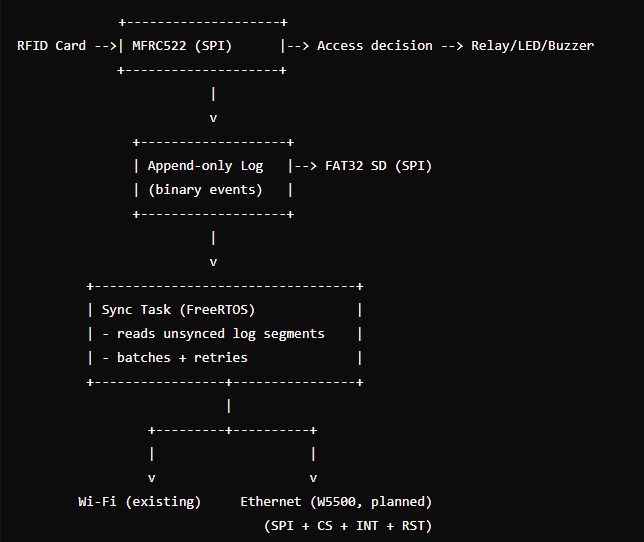 The most meaningful engineering choice here is the offline-first “SD is source of truth” stance. A door must unlock (or refuse) even when the internet is down, and audit logs must survive brown-outs. That’s exactly what append-only logging is good at: you avoid rewriting earlier records, reduce corruption surface area, and can replay/sync forward later. The README explicitly states “SD card is the source of truth,” “append-only binary logs,” and “network layer decoupled from logging logic.”