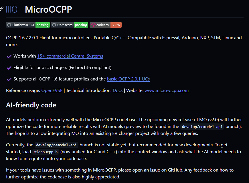 MicroOcpp focuses on the “hard part” of EV charger connectivity: implementing the OCPP behavior and message flow so a charger firmware can communicate with OCPP backends. It’s positioned as portable C/C++ and explicitly targets many platforms (Espressif, Arduino, NXP, STM, Linux, etc.).