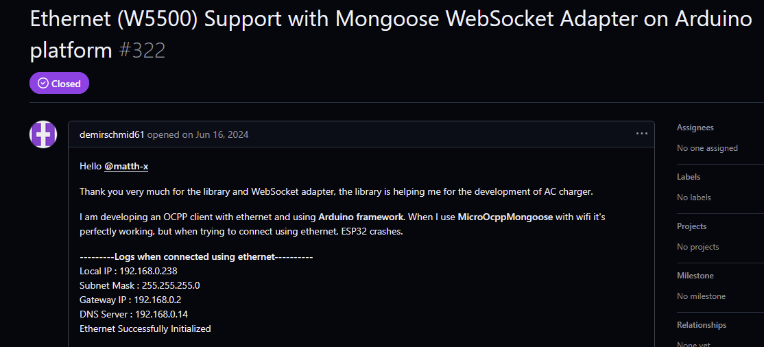 - Another issue asks about Ethernet as the primary requirement for ESP32 + Arduino + MicroOcpp, reinforcing that wired Ethernet integration is a common demand in this ecosystem.