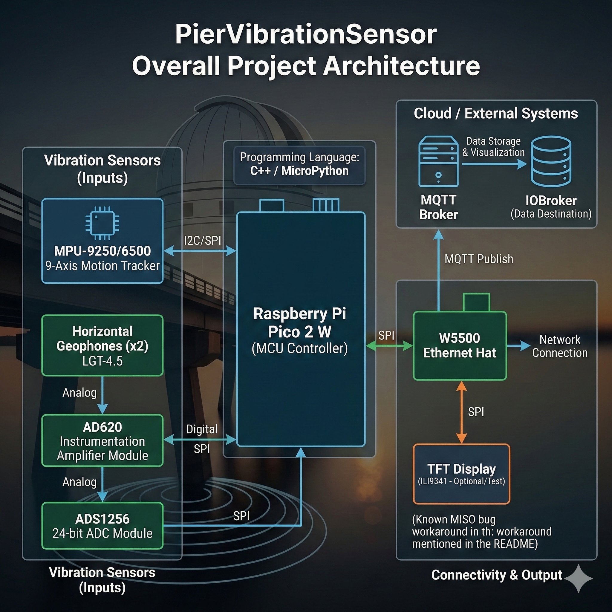 PierVibrationSensor is an embedded vibration-monitoring node built around a Raspberry Pi Pico 2 W and a WIZnet W5500 Ethernet interface.