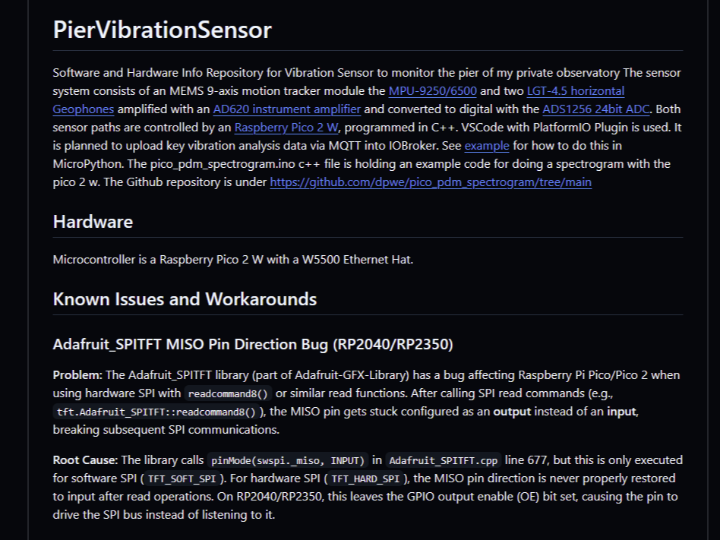 Software and Hardware Info Repository for Vibration Sensor to monitor the pier of my private observatory The sensor system consists of an MEMS 9-axis motion