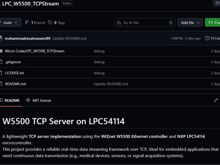 We discovered an intriguing open-source project on GitHub called LPC_W5500_TCPStream, built by Mohammadreza Hosseini. This project shows how to build a real-time streaming TCP server using the WIZnet W5500 Ethernet controller on an NXP LPC54114 microcontroller. GitHub